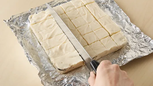 Step4Remove fudge from pan by lifting foil. Cut fudge into squares. Store in refrigerator.
