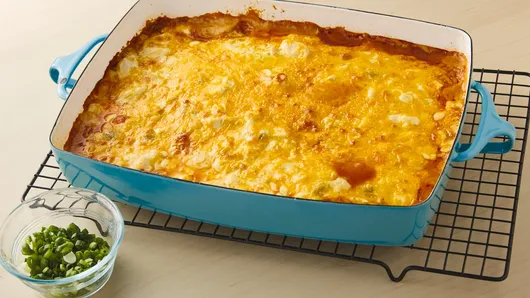 Step3Heat oven to 375°F. Bake covered 30 minutes. Uncover baking dish; bake an additional 20 to 25 minutes or until sauce is bubbly and cheese begins to brown. Let stand 15 minutes before serving. Sprinkle with onions.