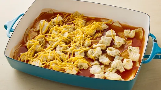 Step2Spread 1/4 cup of the enchilada sauce in sprayed baking dish. Arrange half of the tortilla pieces over sauce, overlapping as necessary. Spoon and spread 1 cup enchilada sauce evenly over tortillas. Spread half of chicken mixture over sauce. Top with 1 cup of the cheese. Repeat layers, starting with tortilla pieces. Cover tightly with sprayed foil. Refrigerate at least 8 hours or overnight.