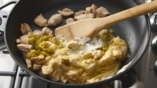 Step1Spray 13x9-inch (3-quart) glass baking dish and 16x12-inch sheet of foil with nonstick cooking spray. Heat large nonstick skillet over medium-high heat until hot. Add chicken; cook 3 to 4 minutes or until chicken is no longer pink in center, stirring frequently. Remove from heat. Stir in soup, sour cream and chiles.