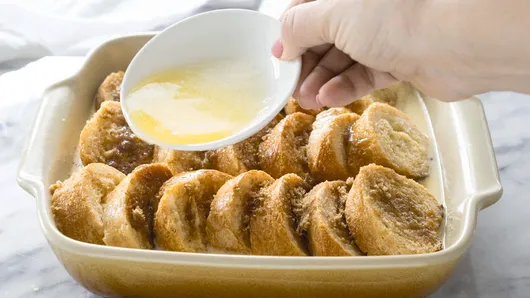 Step3Sprinkle top of soaked bread with mixture of 1/4 cup packed brown sugar and 1/2 teaspoon ground cinnamon. Drizzle 2 tablespoons melted butter over top.