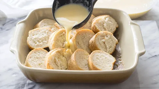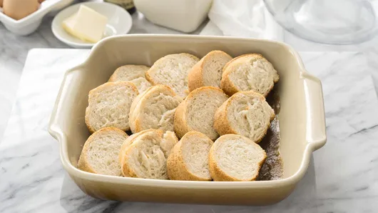 Step1Bake French bread as directed on can. Cut into thick slices. Mix 3/4 cup packed brown sugar and 1/4 cup melted butter in 9-inch square pan. Line pan with sliced bread.