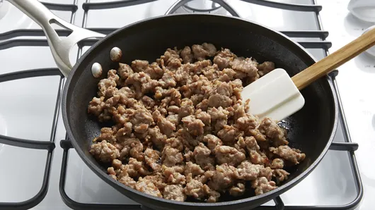 Step1Spray 8-inch square (2-quart) glass baking dish with cooking spray. In 10-inch skillet, cook sausage over medium-high heat 5 to 7 minutes, stirring occasionally, until no longer pink; drain.