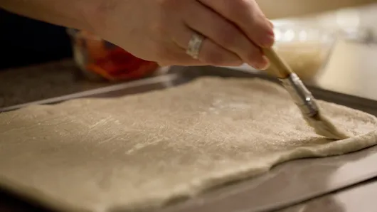 Step1Heat oven to 400°F. Grease large dark or nonstick cookie sheet with shortening or cooking spray. Unroll dough on cookie sheet. Press out dough to 15x10-inch rectangle.