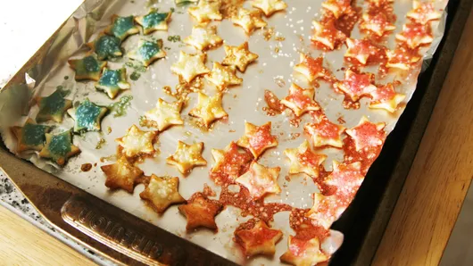 Step2Unroll pie crust onto cutting board. Using mini (1-inch) star-shaped cookie cutters, cut out stars, and place on cookie sheet. Gather and reroll dough to maximize the number of stars you get.