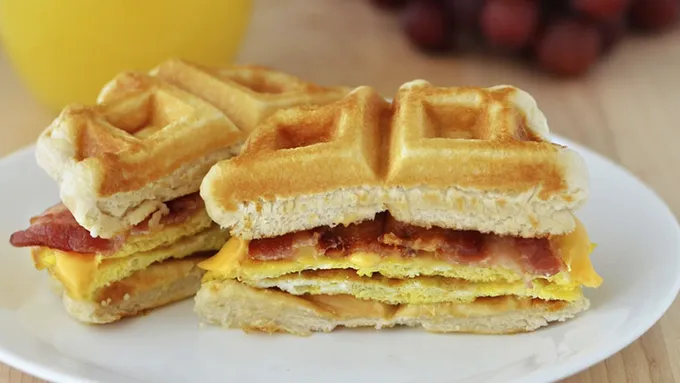 Easy biscuit waffles turn into kid-friendly peanut butter and jelly sandwiches.