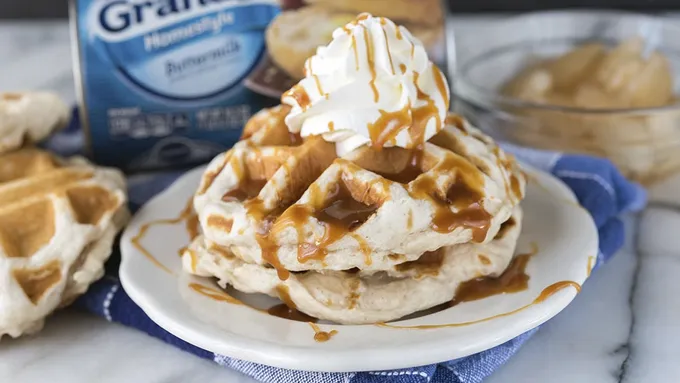 Step1Heat Belgian or regular waffle maker according to manufacturer's directions. Separate dough into 8 biscuits; press or roll each into 4-inch round.