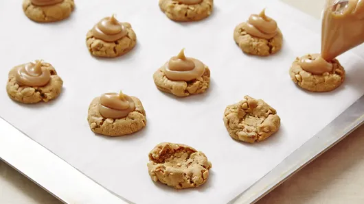 Step3Place peanut butter mixture in large resealable food-storage plastic bag. Cut off small corner of bag. Squeeze bag to pipe about 1 tablespoon mixture in center of each cookie to fill indentation.