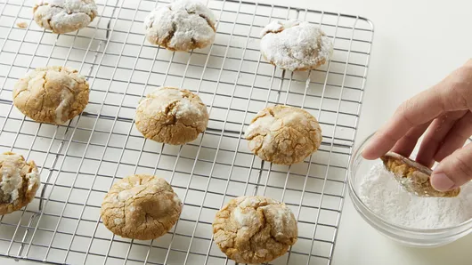 Bake 10 to 13 minutes or until edges are golden brown. Cool 1 minute; remove from cookie sheets to cooling racks. Cool 5 minutes. Dip top of each cookie in remaining 1/4 cup powdered sugar. Cool completely, about 30 minutes.