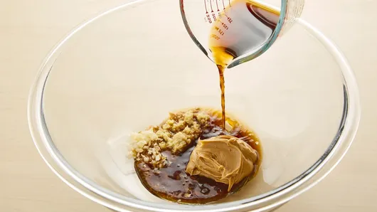 Step2In large bowl, mix peanut butter, water, soy sauce, vinegar, gingerroot and garlic using whisk.