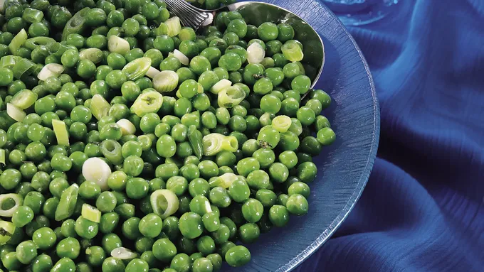 Instead of being boiled, frozen peas are defrosted, then sautéed with mushrooms, onion, celery and pimientos.