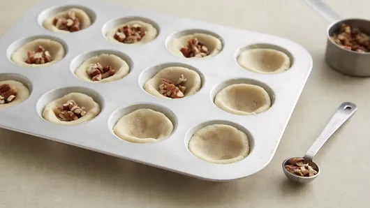 Step1Heat oven to 350°F. Grease and flour 24 mini muffin cups. Place 1 cookie dough round in each muffin cup. Gently press thumb into each dough-filled cup, making small indentation. Fill each cup with about 1/2 teaspoon chopped pecans.
