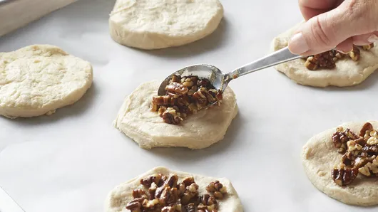 Step1Heat oven to 350°F. Line large rimmed baking pan with cooking parchment paper. Separate dough into 8 biscuits. Separate each biscuit into 2 layers, making a total of 16 thin biscuits. In small bowl, mix 1/2 cup chopped toasted pecans, 1 tablespoon brown sugar and the melted butter. Evenly divide pecan mixture among bottom biscuit halves. Place biscuit tops on top of pecan mixture. Bake 18 to 22 minutes or until biscuits are golden brown. Cool on pan 5 minutes.