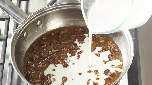 Step2Meanwhile, in 1 1/2-quart saucepan, melt 4 tablespoons butter over medium heat. Add 1/2 cup brown sugar and 1/2 cup chopped pecans; cook 2 to 4 minutes, stirring frequently, until sugar melts and pecans smell toasted. Reduce heat to low; carefully stir in whipping cream and vanilla. Heat to simmering. Cook 1 to 2 minutes, stirring constantly, until thickened. Pour over cooked biscuits.