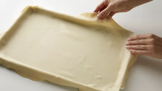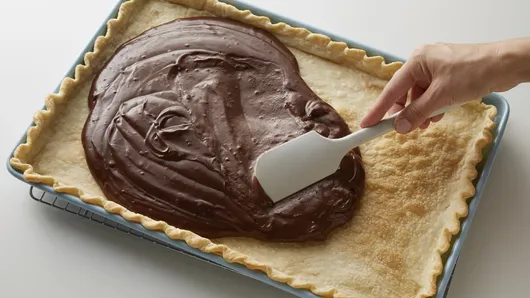 Step2Fit crust into ungreased 15x10x1-inch pan, pressing firmly into bottom, corners and sides. Fold extra crust underneath and slightly on top of pan; flute edges. Prick bottom and sides of crust with fork. Bake 10 to 12 minutes or until golden brown and completely baked. Remove to cooling rack; cool 10 minutes.
