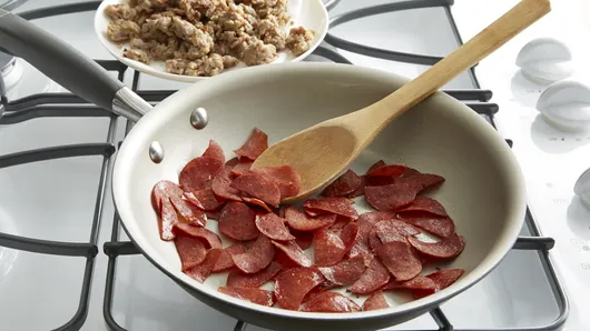 Step2In large skillet, brown sausage over medium-high heat 5 minutes, stirring occasionally, until pork is no longer pink. Drain and set aside. Wipe skillet clean. Add pepperoni, and cook over medium-high heat 4 minutes, stirring occasionally, until slightly crisp.