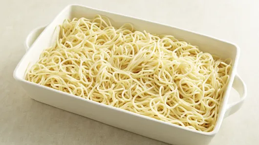 Step1Heat oven to 350°F. Lightly spray 13x9-inch (3-quart) baking dish with cooking spray. Cook spaghetti with 1/2 teaspoon salt according to package directions. Drain well, and place in baking dish.