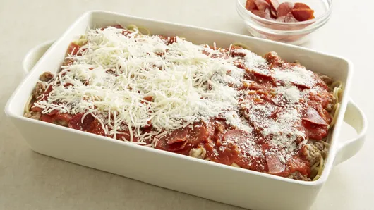 Step3Top spaghetti in baking dish with sausage; pour pasta sauce over sausage. Arrange half of pepperoni slices evenly over pasta sauce. Sprinkle evenly with cheeses. Arrange remaining half of pepperoni slices evenly over cheese. Cover with nonstick or lightly greased aluminum foil.