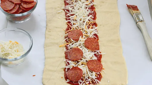 Step2Unroll dough on cookie sheet. Press into 13x8-inch rectangle; if using crescent rolls, firmly press perforations to seal. Spread pizza sauce in 3 1/2-inch-wide strip lengthwise down center of dough all the way to ends. Layer half the pepperoni slices and cheese over sauce; repeat.