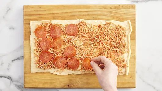 Unroll 1 can of dough on work surface; reshape into 12x8-inch rectangle and press perforations to seal. Place half of the cheese mixture evenly on top of dough; top with half of the pepperoni.