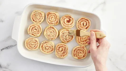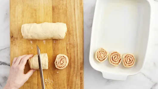 With serrated knife, carefully cut each roll into 6 slices, about 1 1/4 inches wide, and arrange spiral sides up in baking dish, reshaping into round shapes, if necessary.