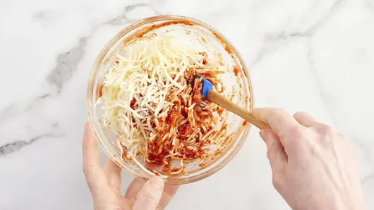 Heat oven to 375°F. Spray 13x9-inch (3-quart) glass baking dish with cooking spray. In medium bowl, mix shredded cheese and 1/2 cup of the pizza sauce.
