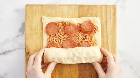 Starting on short edge of rectangle, roll up tightly and pinch seam together. Repeat for remaining dough, cheese mixture and pepperoni.