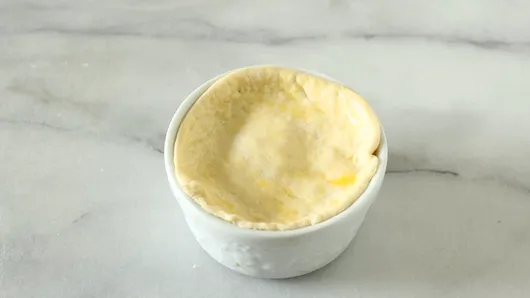 Step3Sprinkle work surface with flour. Unroll dough onto work surface; sprinkle dough with flour. Use round cookie cutter to cut out 4 rounds of dough slightly larger than top of ramekin. Place 1 round on top of each ramekin; gently press down dough. Brush dough with beaten egg.