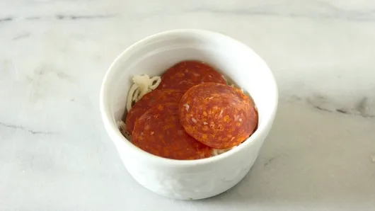 Step2In each of 4 (2-cup) ovenproof ramekins or individual baking dishes, place 2 tablespoons pizza sauce. Sprinkle 1/2 cup cheese over sauce in each ramekin. Arrange 4 slices pepperoni, overlapping slightly, on top of cheese in each ramekin. Spread 1 tablespoon of pizza sauce over pepperoni in each. Fill each with another 1/2 cup cheese.