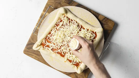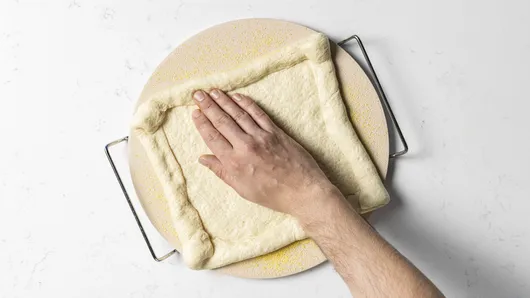 If using classic crust: Heat oven to 425°F. Sprinkle cornmeal on 12-inch square pizza stone. Unroll dough on pizza stone. Starting at center, press dough into 12-inch square, forming 1/2-inch rim. If using thin crust: Heat oven to 400°F. Spray or grease 15x10-inch or larger dark or nonstick cookie sheet. Sprinkle cornmeal on cookie sheet. Unroll dough on cookie sheet. Starting at center, press dough into 15x10-inch rectangle.