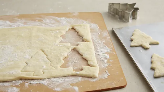 Step2With sprayed and floured 2 1/2-inch tree-shaped cookie cutter, cut dough into 24 trees. Place on ungreased cookie sheets.