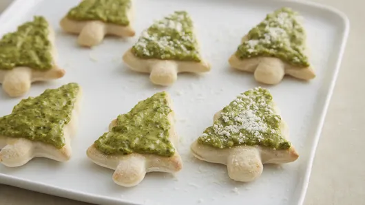 Step4Spread pesto sauce on trees. Sprinkle with Parmesan cheese.