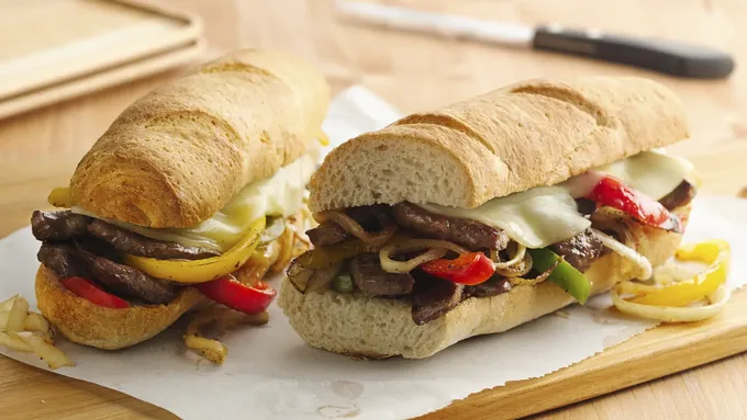 These crescent roll-ups are stuffed with classic Philly cheese steak flavors, including sautéed green bell peppers, onions and roast beef.