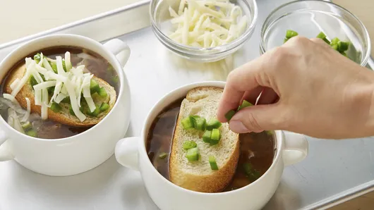 Slices of fresh-baked Pillsbury™ French bread top a beefy onion soup in a classic twist for two.