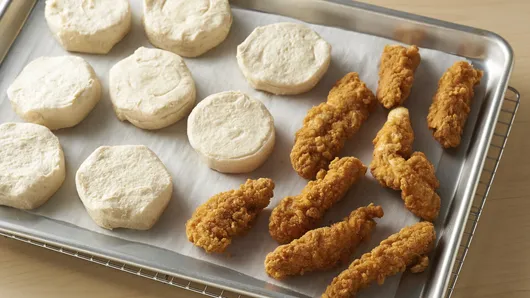 Step2Separate dough into 8 biscuits. Add biscuits to pan. Bake 14 to 16 minutes or until biscuits are golden brown and chicken is crispy.