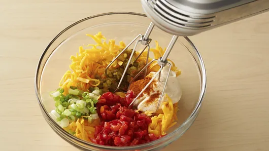 Step4Meanwhile, in medium bowl, beat Pimiento Cheese ingredients with electric mixer on medium speed 1 to 2 minutes or until creamy.
