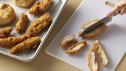 Step3Cool about 2 minutes or until cool enough to handle; cut each piece of chicken in half horizontally. Split each biscuit.