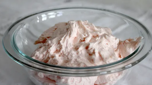 Step4In medium bowl, beat butter with electric mixer on high speed until soft peaks form. Gradually add powdered sugar while beating 1 to 2 minutes. Add champagne and enough food color to create pink champagne buttercream; beat 1 to 2 minutes until stiff peaks form.