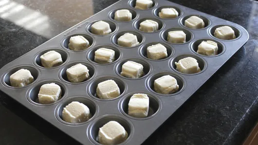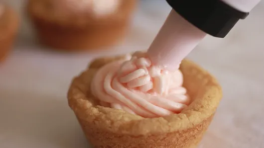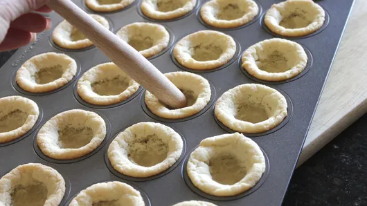 Step3Using end of wooden spoon, carefully press into center of each baked cookie to make 1-inch-wide indentation. Remove cookies from muffin cups onto cooling rack. Cool while making Champagne Buttercream.