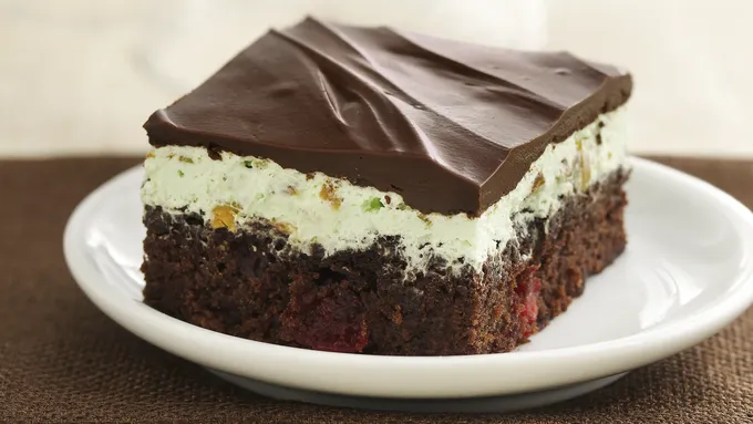 Step3Bake 27 to 30 minutes or until toothpick inserted 2 inches from edge of pan comes out clean. Cool in pans on cooling racks 10 minutes. Run knife around edge of pans to loosen. Place cooling rack upside down on 1 pan; turn rack and pan over. Remove pan and parchment paper. Repeat with second brownie layer. Place racks with brownie layers in refrigerator to cool completely, about 20 minutes.