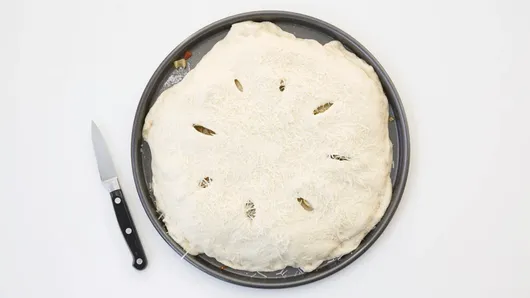 Step2Unroll remaining can of dough. Press out dough on work surface to form 12-inch round. Fold dough in half; place over provolone cheese and unfold. Press outside edges to seal. Cut several slits in top crust for steam to escape. Sprinkle with Parmesan cheese.