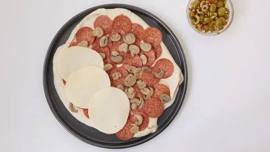 Step1Heat oven to 375°F. Lightly grease 12-inch pizza pan. Unroll 1 can of dough; placing in greased pan. Starting at center, press out dough with hands to edge of pan. Layer pepperoni, mushrooms, olives and provolone cheese over dough.