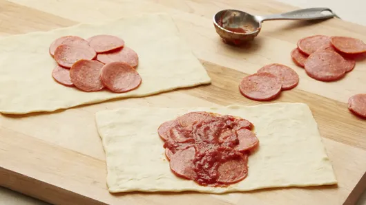 Step3Arrange 9 pepperoni slices in center third of each rectangle. Spread 1 tablespoon spaghetti sauce over pepperoni.