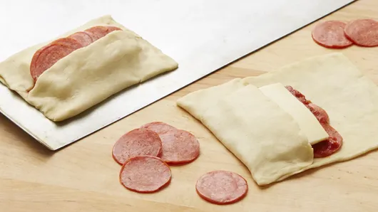 Step4Fold each slice of cheese in half; place over pepperoni. Fold short sides of dough to almost meet in center; securely pinch edges together, leaving middle open. Tuck 4 or 5 pepperoni slices into middle opening. Place on ungreased cookie sheet.