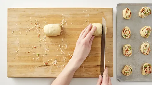 Step4Starting with one short side, roll up each rectangle; press edge to seal. With serrated knife, cut each roll into 6 slices; place cut side down on cookie sheet.