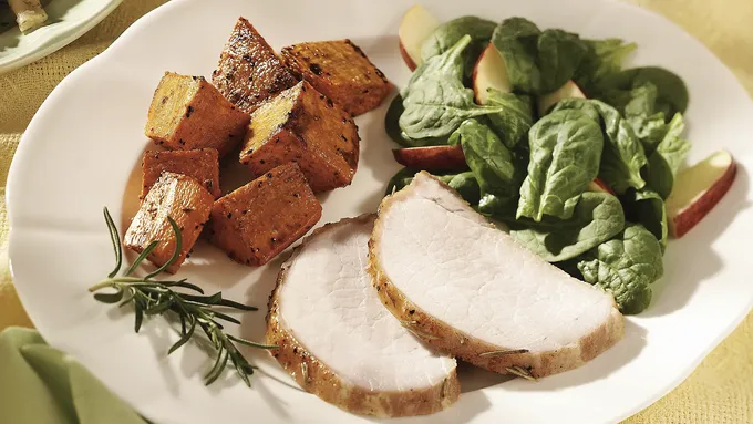 Step1Heat oven to 375°F. Place pork roast in ungreased 13x9-inch (3-quart) glass baking dish. Sprinkle pork with 1/2 teaspoon of the peppered seasoned salt, 1/2 teaspoon of the marjoram and 1/4 teaspoon of the rosemary. Add 1/3 cup water to baking dish.