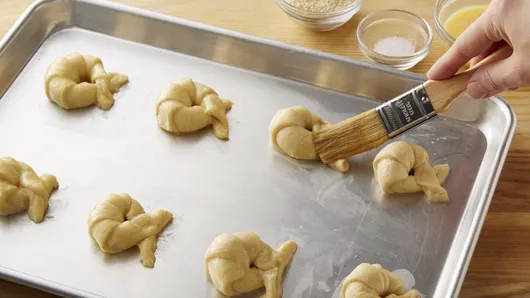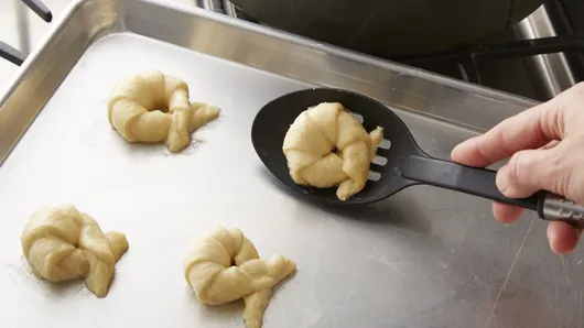 Step6Using metal pancake turner, carefully transfer rolls to cookie sheet. If necessary, reshape rolls into pretzel shape.