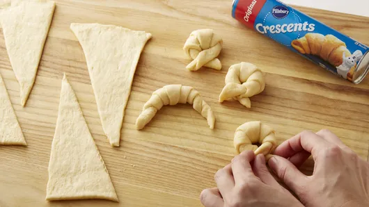Step4Unroll dough onto work surface; separate into 8 triangles. Starting at shortest side of each triangle and stretching dough slightly, roll up loosely to opposite point. Bring ends of dough together; pinch lightly.