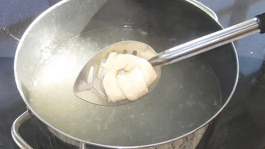 Step5Place rolls, 2 at a time, in boiling soda water; cook 30 seconds. With slotted spoon, remove from water; place on paper towel. Repeat with remaining rolls. Lightly brush tops with egg mixture; sprinkle each with sesame seed and pinch of salt.