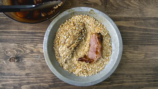 Step3In shallow bowl or pie plate, place crushed pretzels, pepper and olive oil; stir with fork to combine. Dip chicken tenders in pretzel mixture, pressing to coat chicken. Turn chicken over; repeat to coat other side. Place on cookie sheet.